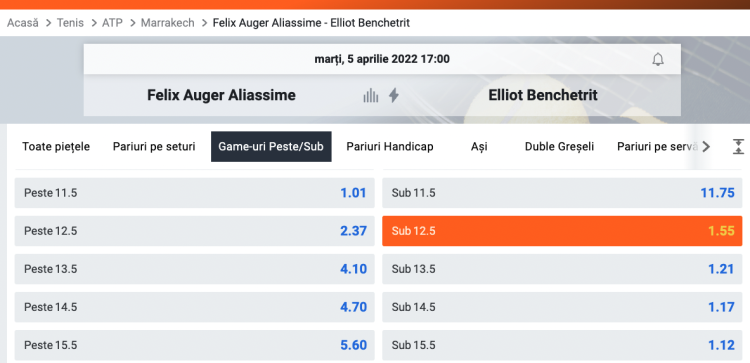 Am ales o cotă cu șanse mari de câștig de la meciul dintre Felix Auger Aliassime și Elliot Benchetrit.