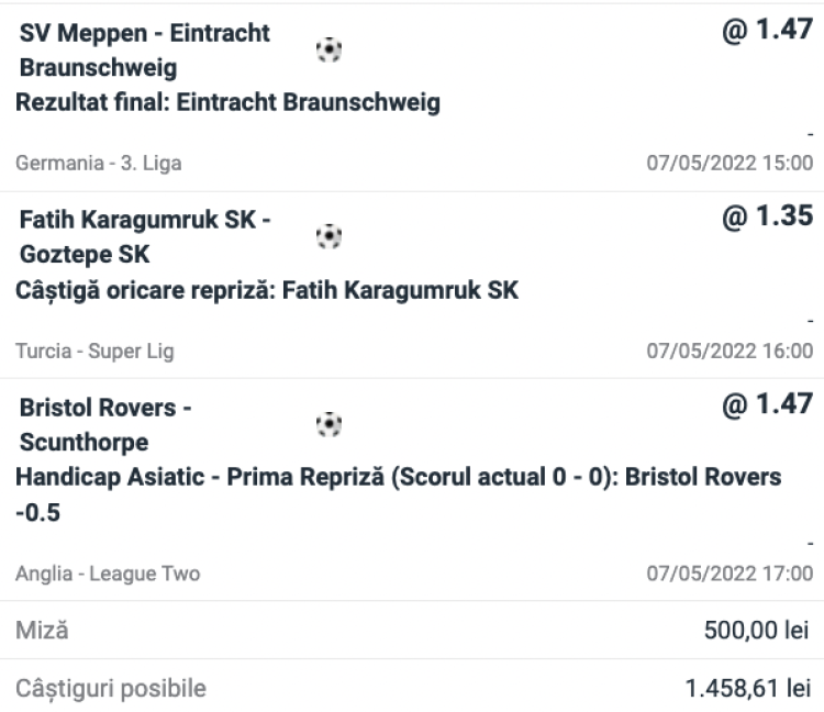 Astăzi, însă, voi plasa primul pariu un pic diferit, în sensul că voi juca direct un bilet format din 3 meciuri la o cotă finală de aproape 3, mai exact 2.90. De ce fac asta? Pentru că toate cele 3 meciuri se califică la proiect conform criteriilor mele de selecție, dar se joacă la ore foarte apropiate, iar în acest caz nu apucă să se termine unul până începe următorul.