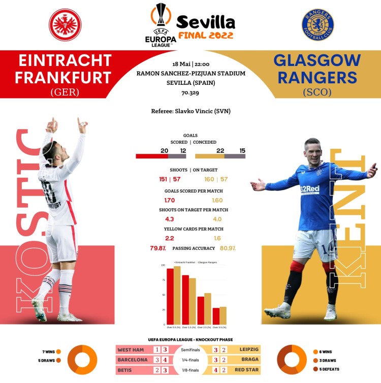 La 50 de ani distanță de la triumful din Winners Cup și la 14 ani de la ultima finală europeană, Rangers poate deveni primul club scoțian care se impune în Europa League. Formația antrenată de Giovanni van Bronckhorst nu și-a putut apăra titlul cucerit sezonul trecut în Scoția, fiind depășită de rivala Celtic. Fanii vor uita totul cu o victorie astăzi. Rangers nu a avut un parcurs la fel de dominant ca Eintracht. A pierdut câte un meci în optimi, sferturi și semifinale, împotriva Stelei Roșii, celor de la Braga și Leipzig. Van Bronckhorst are ceva probleme de lot înaintea finalei. Ianis Hagi, Helander, Morelos și Jack sunt accidentați. Doar cel din urmă are șanse, minime, să apară pe teren. Și fanii scoțieni și-au anunțat prezența în Spania într-un număr impresionant.