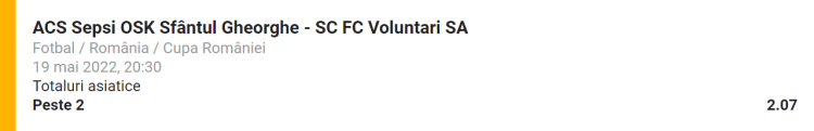 Pontul meu pentru aceasta finala merge pe goluri. Statisticile arata bine in ceea ce priveste cele doua echipe, care au o medie de peste 1.00 gol marcat per meci, iar media golurilor in meciurile in care evolueaza este de peste 2.00. Pe langa aceste aspecte, golurile au fost mereu prezente in intlnirile directe si nu vad de ce in aceasta seara ar lipsi. Asadar, pontul meu pentru partida ACS Sepsi OSK - FC Voluntari este ”Peste 2.0 goluri asiatice”, la o cota de 2.07, disponibila pe Unibet.