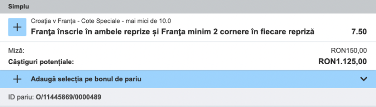 Pe Betfair Sportsbook, cota pentru pariul special Franța înscrie în ambele reprize și Franța are minim 2 cornere în fiecare repriză este @7.50.
