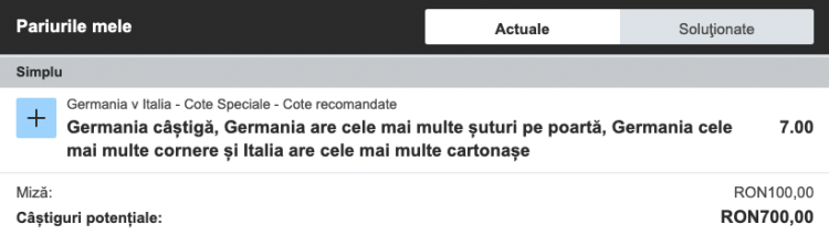 Pe Betfair Sportsbook, cota pentru pariul special Germania câștigă, Germania are cele mai multe șuturi pe poartă, Germania are cele mai mult cornere și Italia are cele mai multe cartonașe este @7.00.