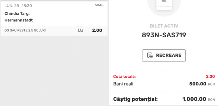 Pe SUPERBET, cota pentru pariul ambele formații marchează SAU peste 2.5 goluri (GG sau 3+) în Chindia - Hermannstadt este @2.00.