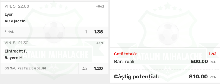 Biletul Zilei format din 2 meciuri la cota 1.62