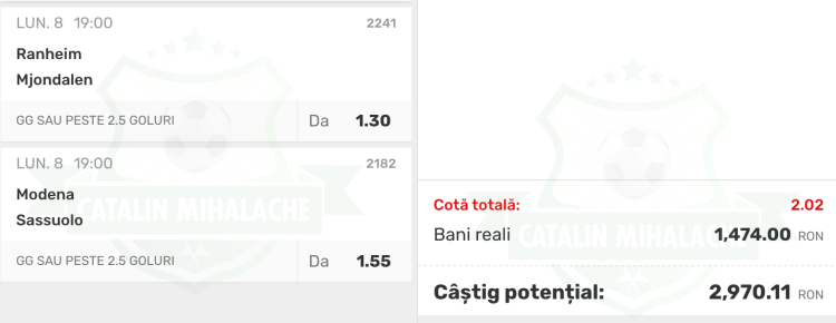 Biletul Zilei format din 2 meciuri la cota 2.02