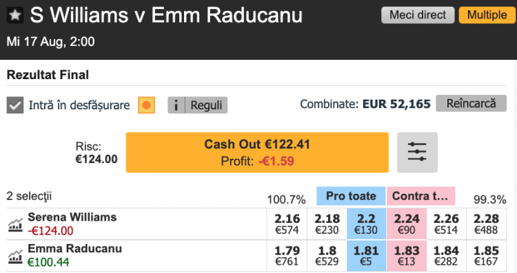 Pe Betfair Exchange, cea mai mare bursă de pariuri sportive din lume, cota pentru pariul de tip PRO pe victoria Emmei Răducanu este @1.81