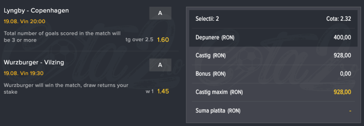 Am jucat acest pariu la MOZZARTBET, casă de pariuri care oferă un pachet de bonusuri de până la 1750 de Lei la înregistrare!