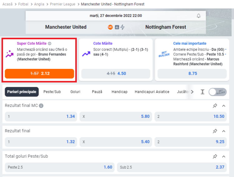 Pentru acest meci am ales se mizez pe unul dintre cei mai buni jucatori ai ”diavolilor”, portughezul Bruno Fernandes. El si cu Eriksen deseneaza jocul lui United si e prima optiune la penalty-uri si lovituri libere. Deasemenea, e un jucator care ofera pase decisive, isi creeaza ocazii si uneori reuseste sa si puncteze. Cota pentru ca el sa marcheze sau sa ofere un assist nu e foarte mare, anume 1.57. Pe Betano insa, aceasta cota are un ”super-boost” si o putem paria la o valoare aproape dubla.