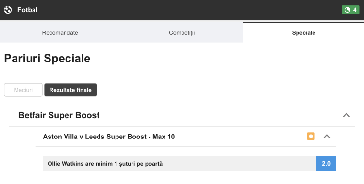 Pe Betfair Sportsbook găsim un pariu special. Cota pentru Ollie Watkins trimite minim un șut pe poartă în Aston Villa - Leeds United este @2.00 în loc de 1.33 la secțiunea Pariuri Speciale - Betfair Super Boost!