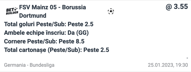 Pe Betano, cota pentru pariul combinat peste 2.5 goluri, GG, peste 8.5 cornere și peste 2.5 cartonașe în Mainz - Dortmund este @3.55 și poate fi jucat cu ajutorul funcției BetBuilder!