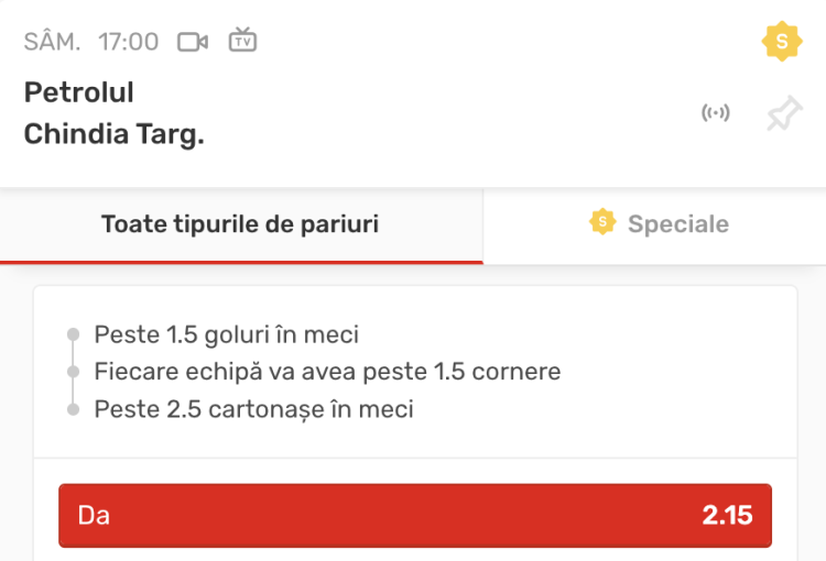 Combinația peste 1.5 goluri în meci, fiecare echipă va avea peste 1.5 cornere și peste 2.5 cartonașe în meci are @2.15 și se găsește în secțiunea de SuperPariuri a meciului de la Superbet.