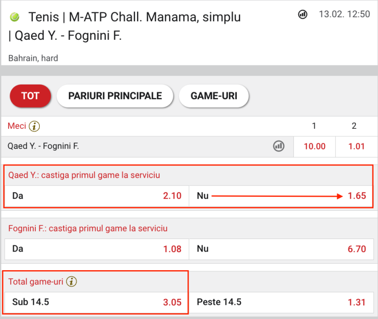 Din punctul meu de vedere, dacă Fognini tratează meciul cu seriozitate, ar putea să-l ciomăgească 6-0/6-0 fără discuții, dar mi-a atras atenția o cotă de 1.65 pentru Qaed să NU câștige primul game la serviciu...ar trebui să fie bifată fără emoții și voi încerca și cota de 3.05 disponibilă în Casa Pariurilor pentru SUB 14.5 game-uri în meci...în traducere liberă, să nu câștige jucătorul de padel mai mult de 2 game-uri.