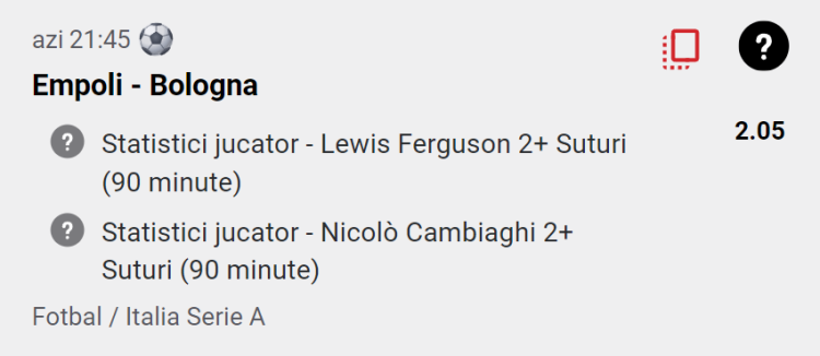 Pontul meu pentru meciul Empoli - Bologna este ”Nicolo Cambiaghi 2+ suturi & Lewis Ferguson 2+ suturi”, la o cota de 2.05, disponibila pe Casa Pariurilor, cu ajutorul functiei ”PLAYMAKER”.