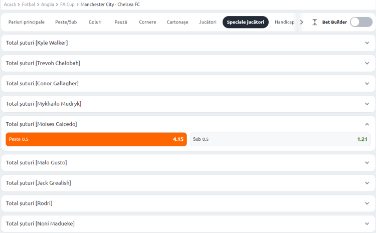 Pontul meu pentru meciul Manchester City - Chelsea este ”Moises Caicedo 1+ suturi”, la o cota de 4.15, disponibila pe Betano, in sectiunea ”Speciale Jucatori”.