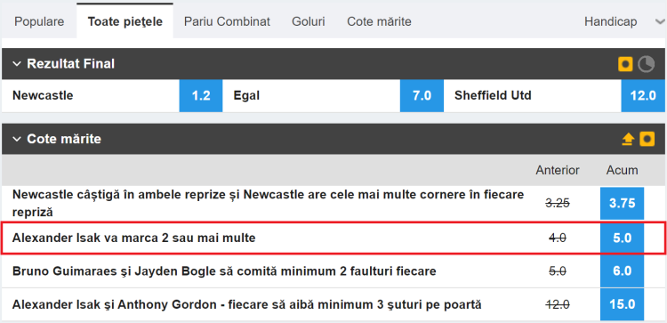 Pontul meu pentru meciul Newcastle United - Sheffield United este ”Alexander Isak marcheaza 2+ goluri”, la o cota de 5.00, disponibila pe Betfair Sportsbook, in sectiunea ”Cote Marite”.