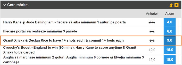 Pontul meu pentru meciul Anglia - Elvetia este ”Granit Xhaka & Declan Rice 1+ suturi fiecare & 1+ faulturi comise fiecare”, la o cota de 9.00, disponibila in rubrica ”Cote Marite” de pe Betfair Sportsbook.